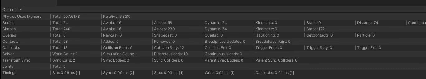 除此之外,物理这块内存按经验往往是一些引擎生成的不受控制的网格碰撞体容易导致高占用。可以对比看下是在什么条件下观察到该问题的,是否出现在某次版本更新后?也可以开关一些游戏对象、引擎设置里物理相关的功能看看有没有关联。