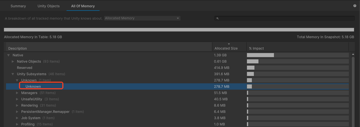 A1:最近有了解到有个办法能看到Unity Subsystem下面Unknown(Unrooted)部分中的内存类型和引用堆栈,不过需要Unity 6+Memory Profiler 1.1.9+编辑器环境,如果能够在这个条件下复现泄露问题,可能能看到更多细节: