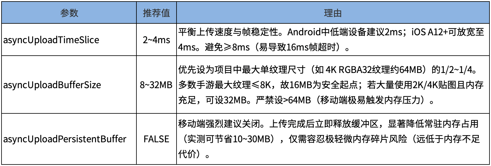 Async Asset Upload下Time Slice和Buffer Size在移动端分别如何设置