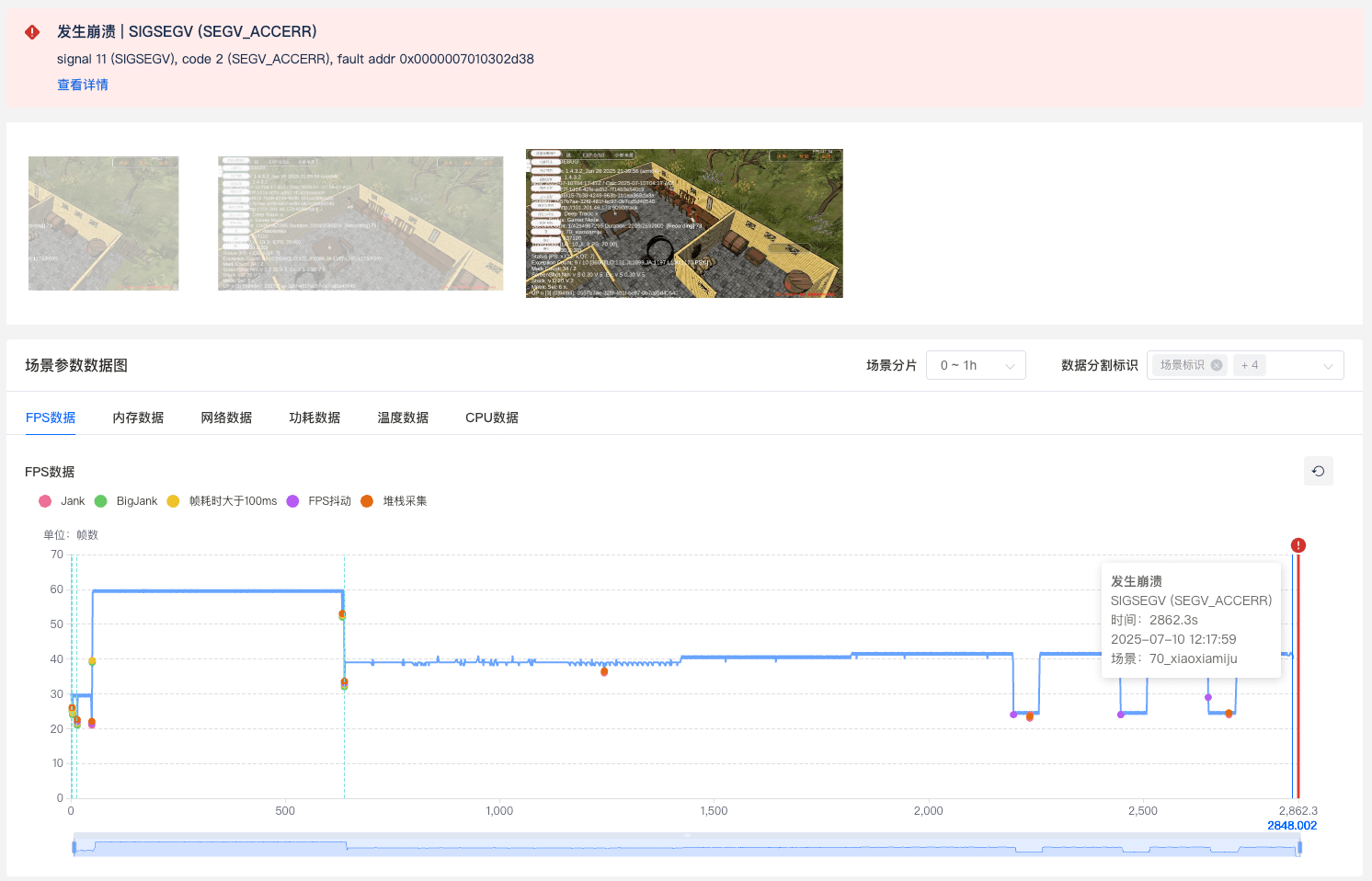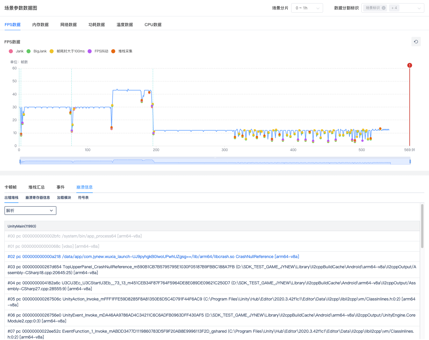 作为原有强项,依旧保持对C/C++层异常的毫秒级捕获能力。不仅能同步引擎调用栈、寄存器状态与加载模块信息,更可联动崩溃前的画面截帧、FPS波动、内存峰值与CPU负载数据,让内存泄漏、模块冲突等底层顽疾无所遁形。