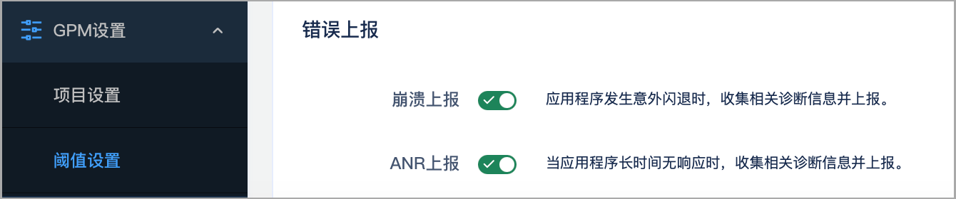 此前开启/关闭崩溃、ANR上报需技术团队通过集成SDK时的宏命令调整,不仅依赖开发资源,变更策略还需等待App发版,响应效率低。本次开放的网页端开关功能,实现“自主化、快响应”管控。