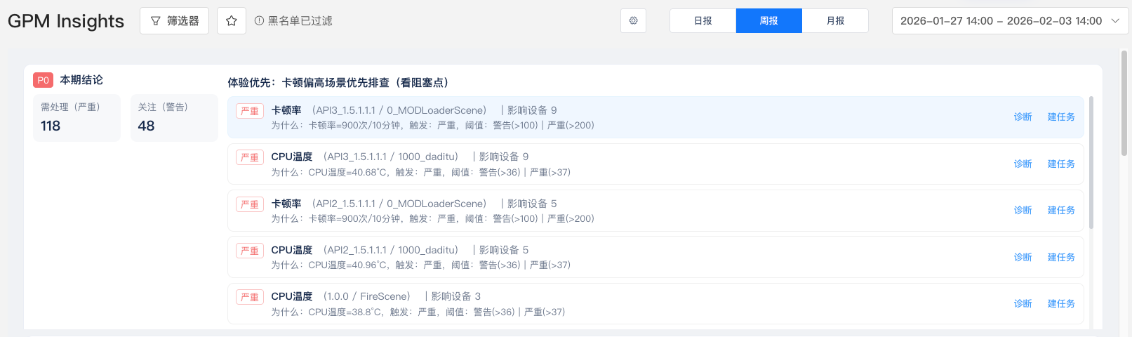 针对海量报告层层筛查的低效痛点,GPM Insights功能打造“版本-场景-机型”三维性能健康度总览面板,省去人工逐个筛选的繁琐流程,实现问题维度“一键可见”。