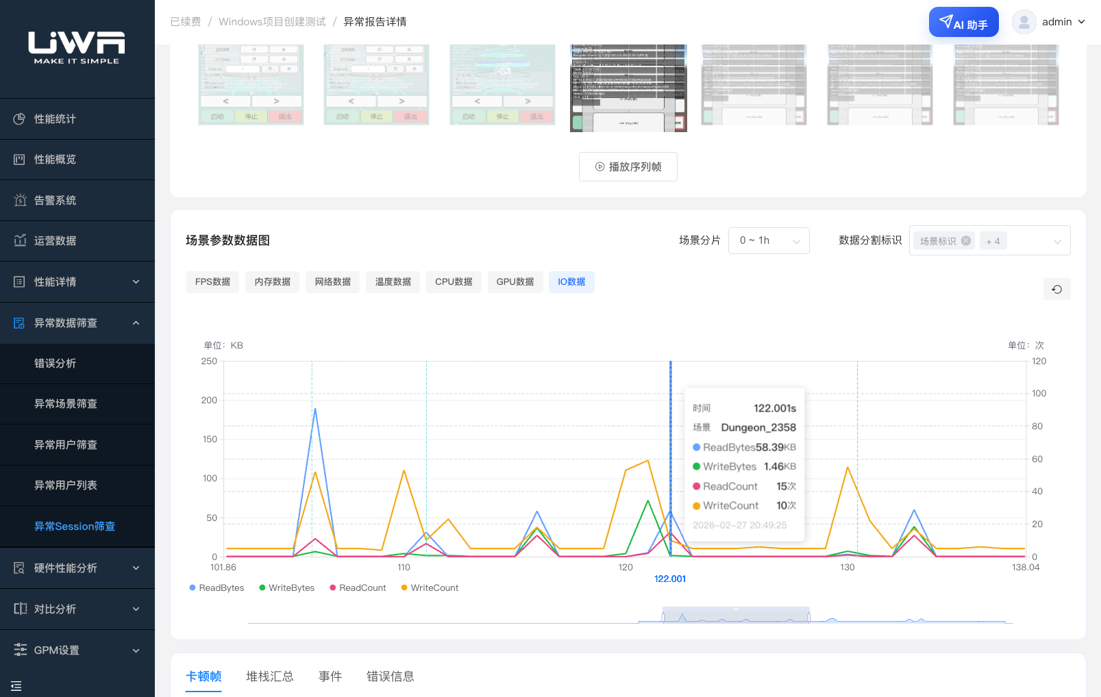 全新上线的「PC端玩家画面截帧」功能,将移动端成熟的截帧监测能力延伸至PC端,实现玩家操作轨迹与异常场景的可视化还原。当PC端出现性能卡顿、程序错误等问题时,可在异常报告中查看问题触发前后的画面截帧,并联动性能参数曲线、自定义事件,清晰还原玩家行为路径与操作细节。支持按玩家、问题类型、时间节点精准筛选截帧内容,直观捕捉技能释放、场景切换、多窗口交互等操作中的异常诱因,快速定位机型、GPU适配的渲染问题或玩家操作引发的功能异常。可搭配「玩家行为洞察」的协作笔记功能,对关键时间戳添加注释,实现团队协同排查,大幅降低PC端问题复现与分析成本。