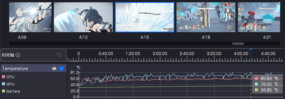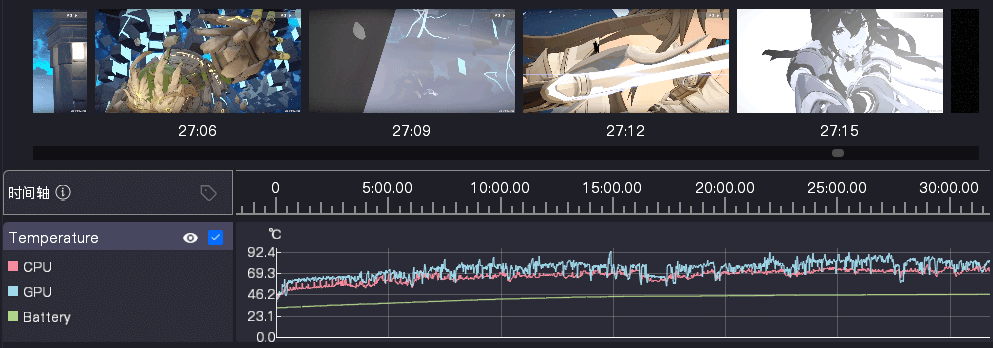 GPU温度在战斗时显著高于CPU温度,并在战斗场景中持续上涨。