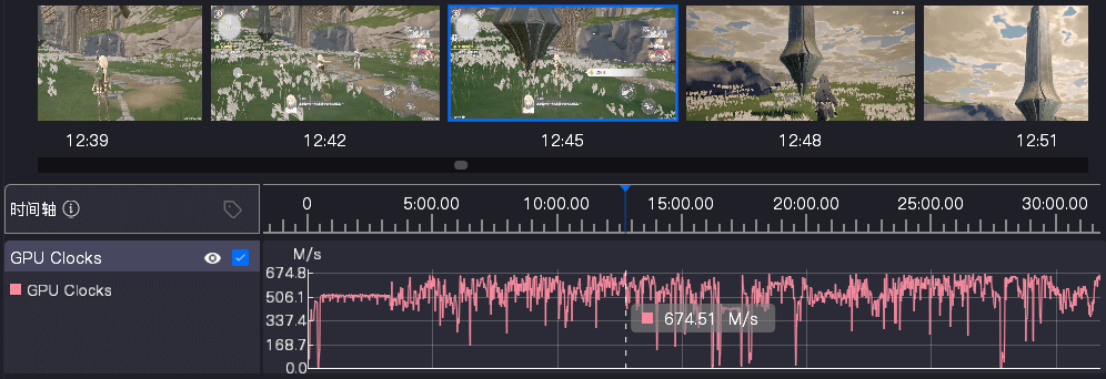 部分场景下,GPU Clocks(时钟频率)持续达到或接近芯片算力上限。更重要的是,GPU Clocks的压力上涨位置与FPS的波动位置完全一致。