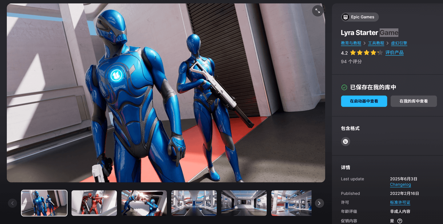 Fab上直接搜索Lyra,找到图示的这个项目,点开之后加入到库里。点击在启动器查看,或者直接在启动器里搜索Lyra。