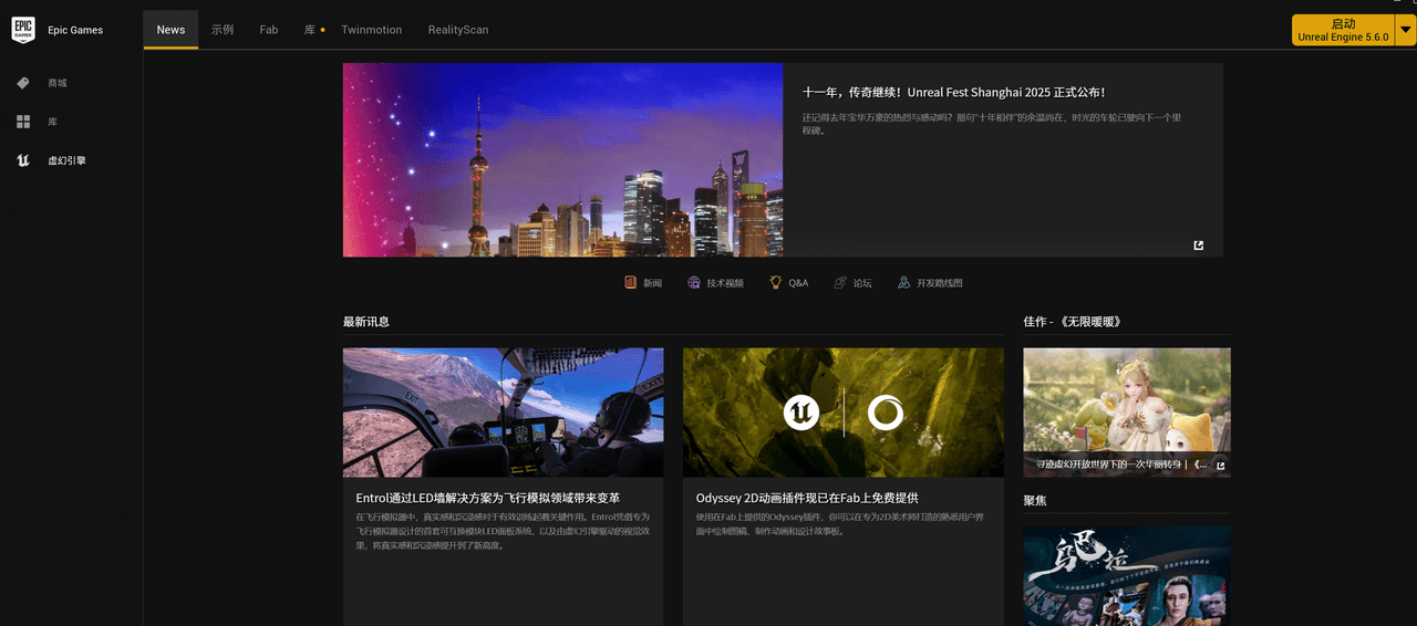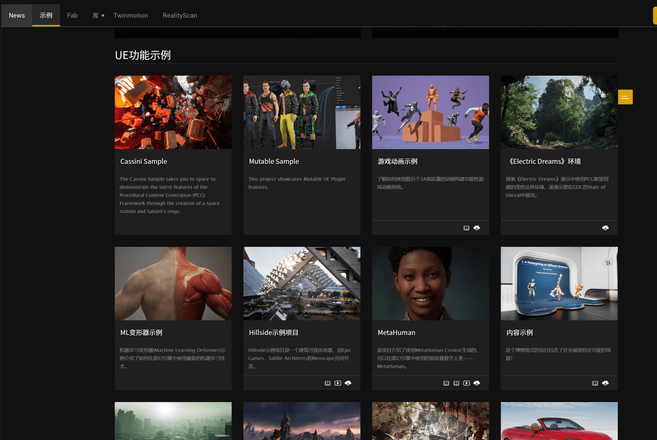 - Fab:是EPIC多个资产商城的合集,可以下载大量的三方插件、代码和资产之类的。不过它需要在单独的页面打开才能看,启动器里只是一个跳转入口。你甚至可以在这里下载Unity的插件和资产。