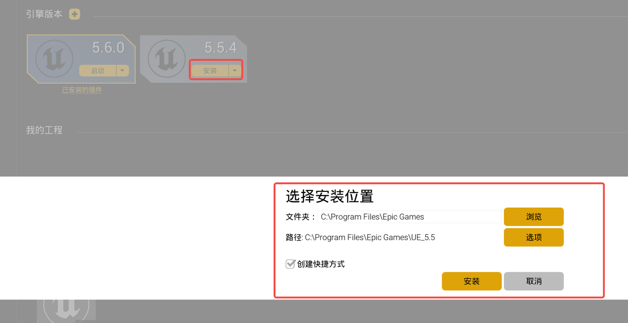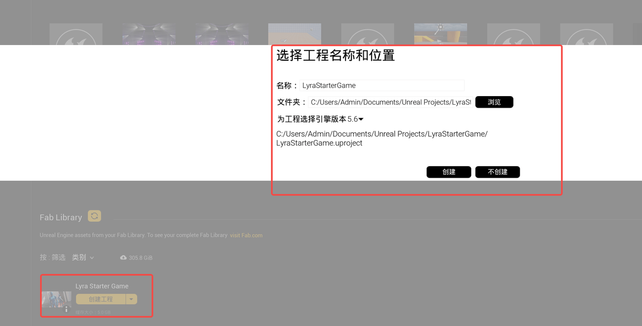注意,这个库是引擎标签的库,不是最外层的游戏库。找到之后,点击创建,设置好目录,等待下载完成就可以了。