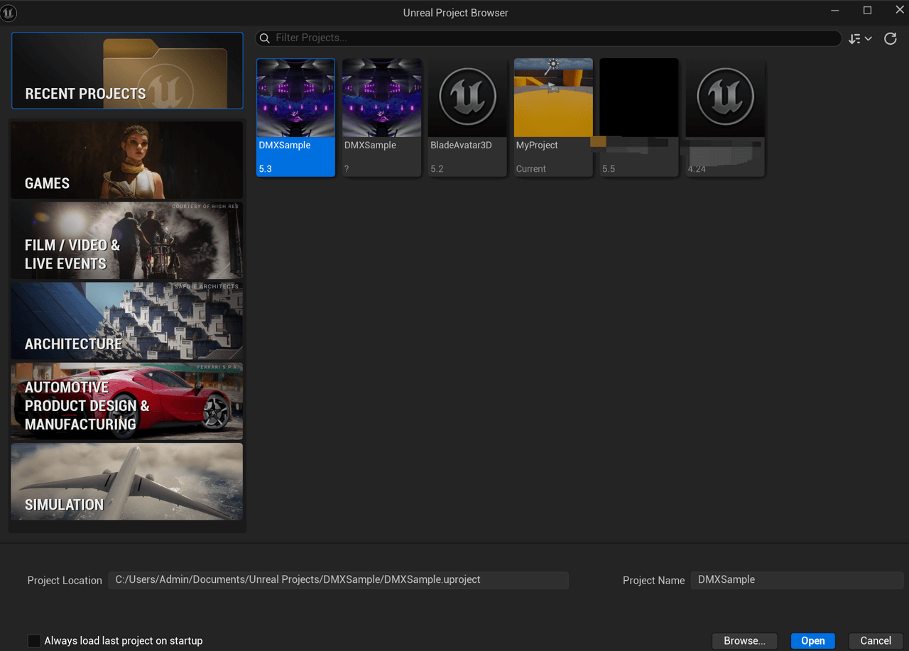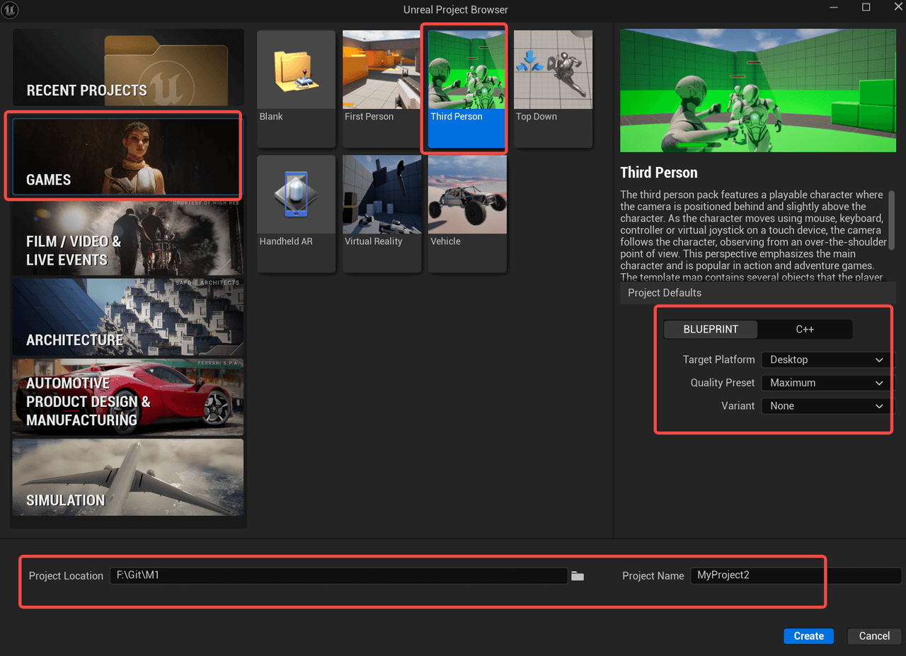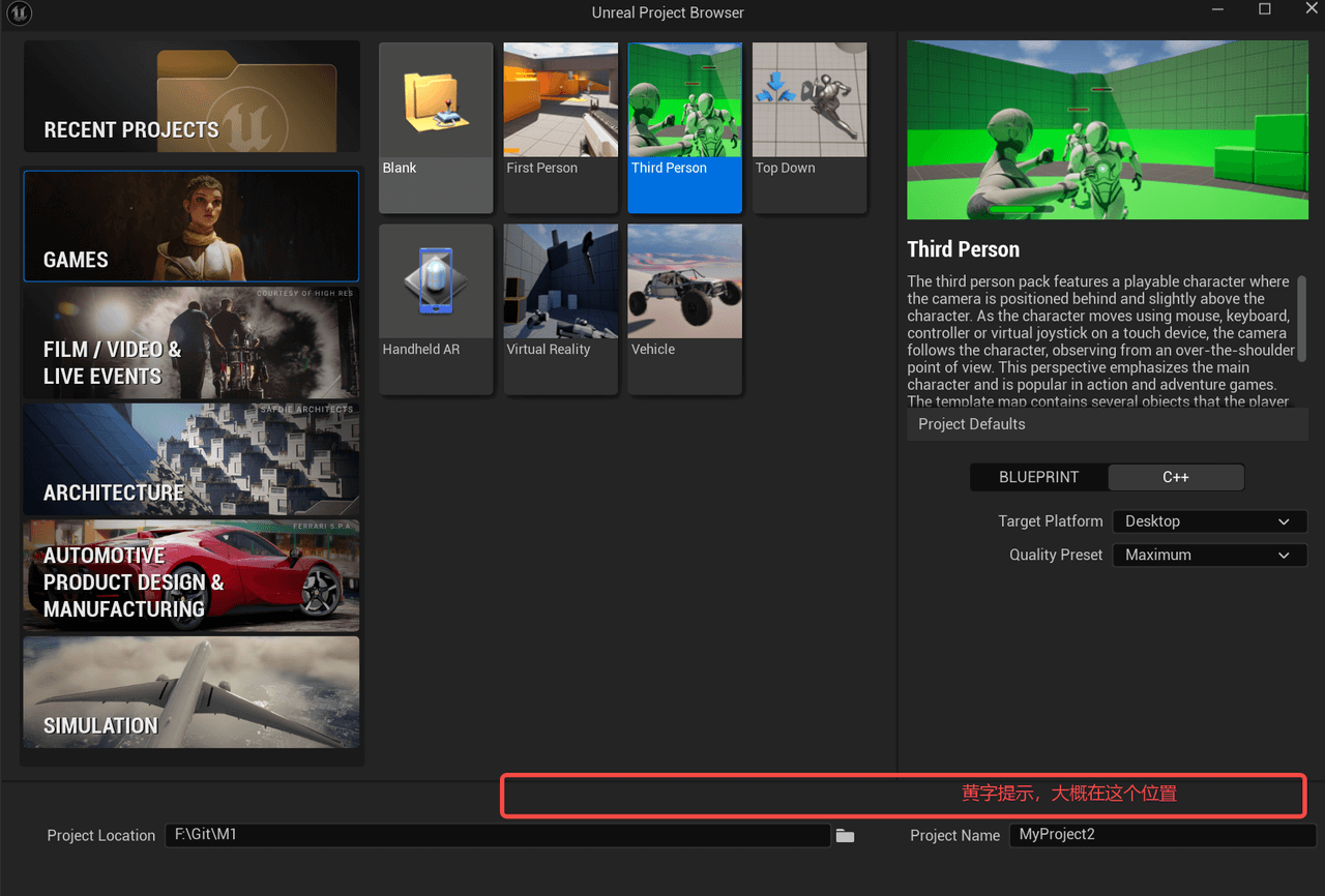 比如我要新建一个第三人称的示例项目就可以通过点击右侧Games标签来完成。