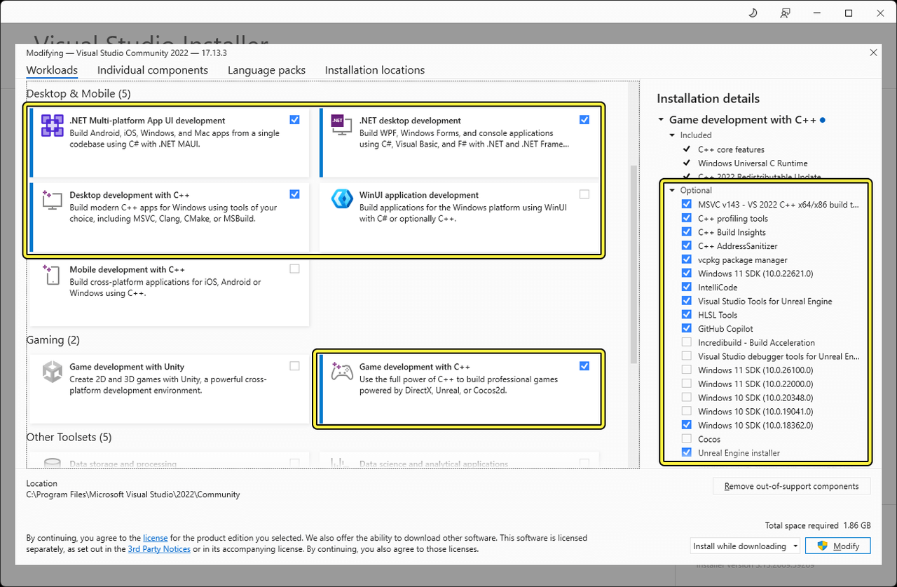 到这里就需要注意了,如果你是新手还不懂代码,只想用蓝图的话,现在就已经可以开工了。但是如果蓝图不能满足或者未来不能满足你的要求,就必须切换成 C++的版本。由于C++是代码,就必须要安装对应的编译环境才可以工作。这是UE附加的必要条件,只要你用代码,就必须要安装。一般我们是安装Visual Studio 2022的社区版本。因为它是免费的。