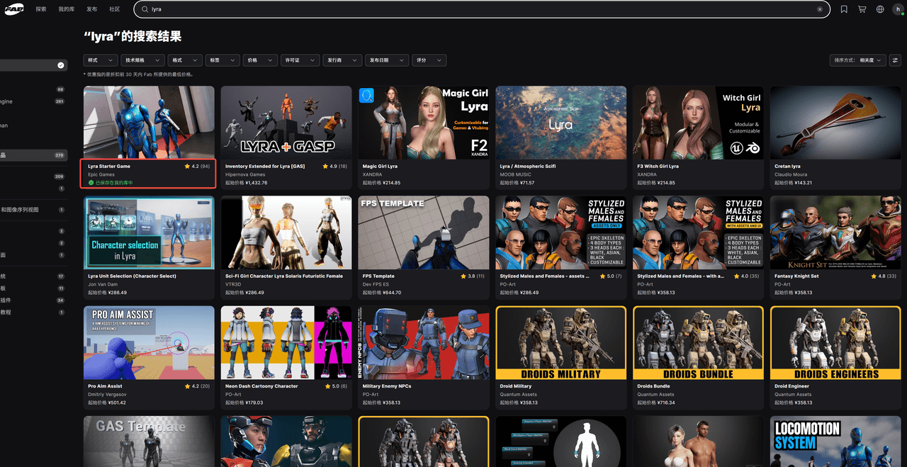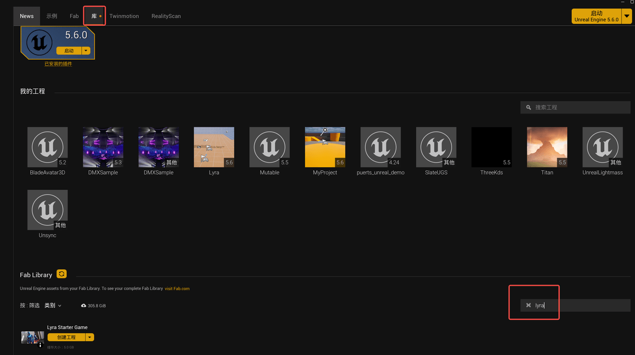 Lyra示例工程需要到Fab上先订阅,再在Epic启动器里下载。