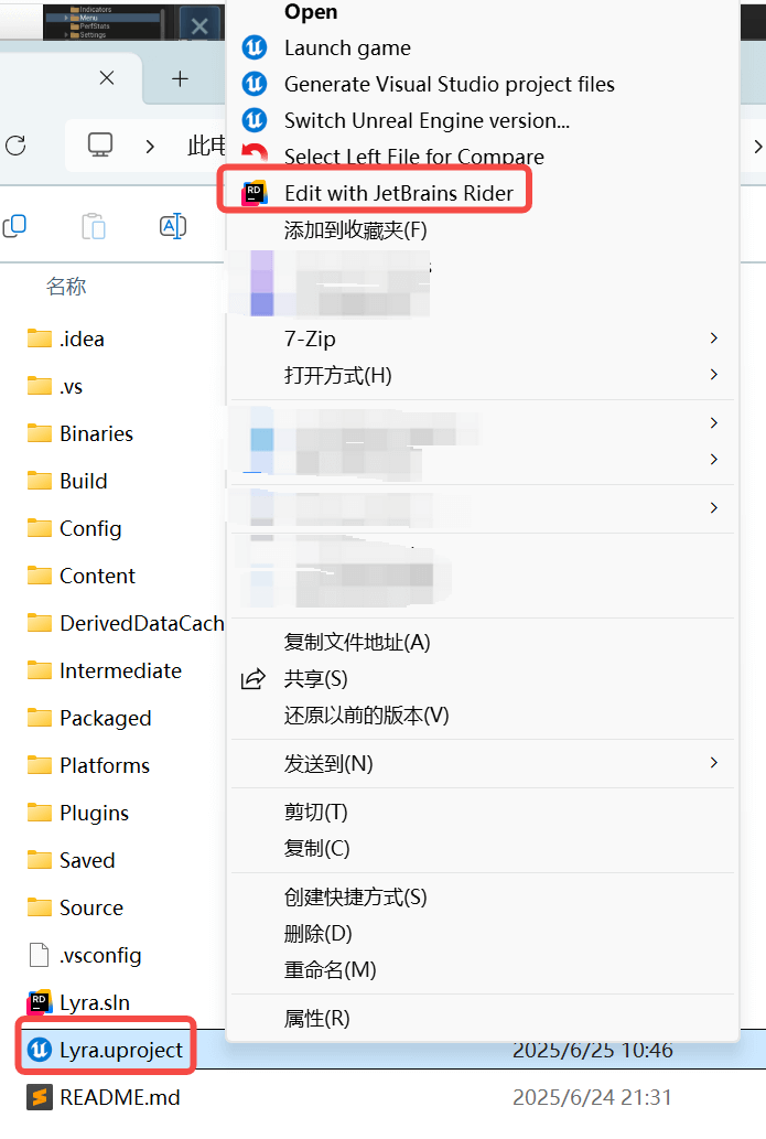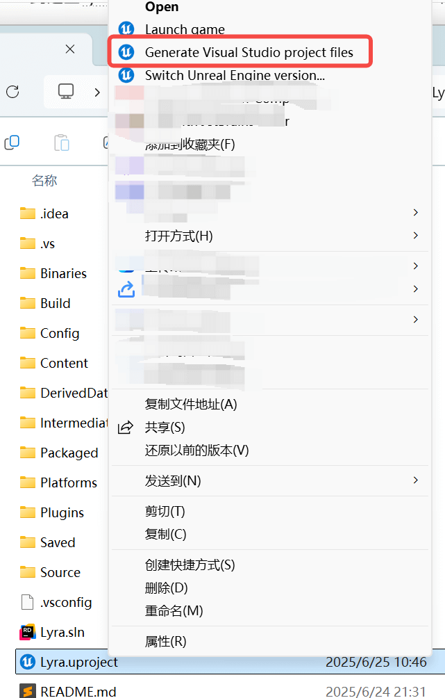 由于Lyra是一个C++工程,在运行之前,必须要先编译才行。右键uproject文件,执行代码工程的生成,完成之后会有一个.sln的文件出现,代表生成成功。