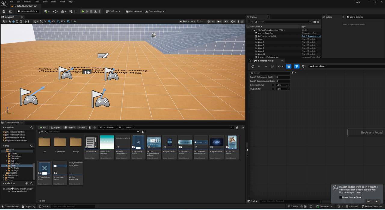 这个时候双击Lyra,就可以打开Lyra工程了。当然,由于Lyra工程引入了大量新的材质,所以第一次启动也是会编译较长时间,请耐心等待,编译后会自动打开编辑器界面。