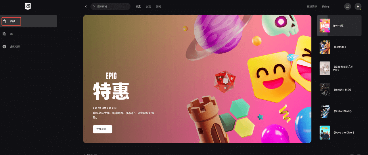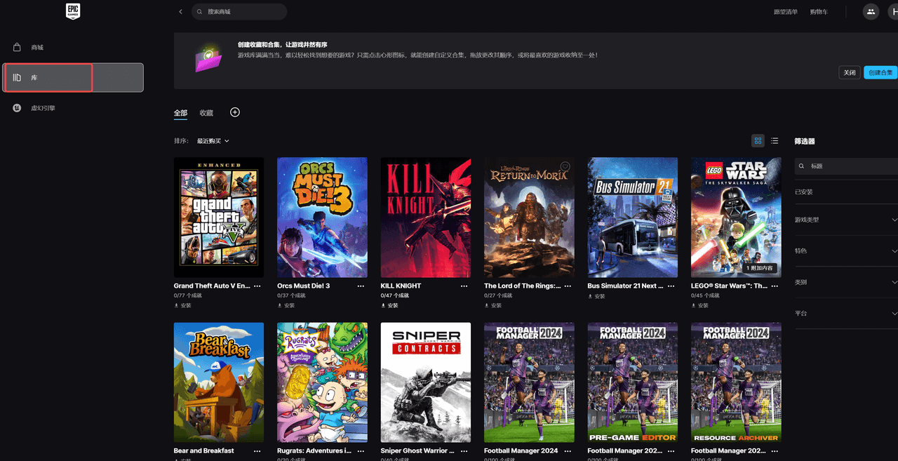 其中右边有三个页签,商城、库和虚幻引擎。前两个就跟Steam平台一样,展示的是作为游戏平台的内容,库则是你已经拥有的游戏。友情提示,Epic平台每周可以免费领取1~2款游戏,重大活动时候免费送大型游戏,可以保持关注。