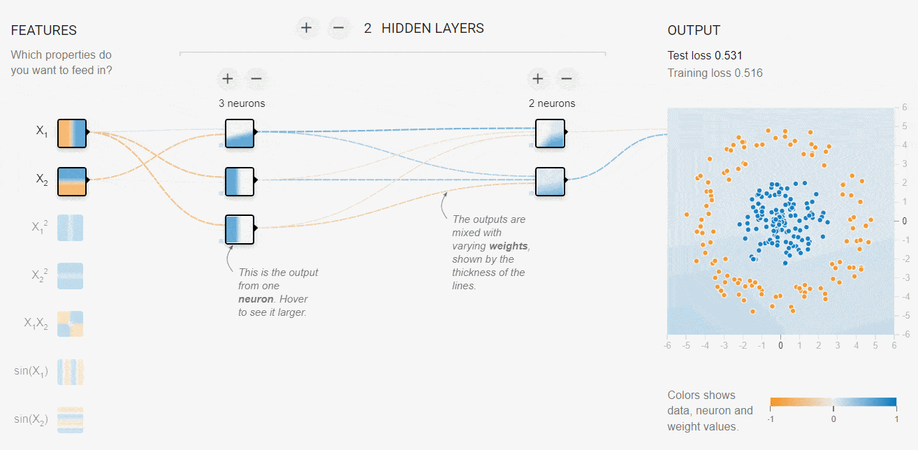 我们会给出一些输入以及该输入所对应的正确输出,比如我们可以记录小明上个学期玩网游时的各因素值以及不玩时的各因素值,这些作为「训练集」。然后设计一个「损失函数」评判当前神经网络的输出与正确输出之间的差距。而程序就是不断地调节各个权重,使差距越来越小,这种调节的根据是「导数」,但在这里我就不展开了。总之,如果训练得当,神经网络的损失就会越来越小,直到停在一个值附近,这就是「收敛」。